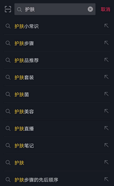 当我搜索护肤,相应着在抖音搜索框里,也会跟着出来相关搜索词,其实都是潜在用户在搜索的关键词。思路是把这些关键词写在标题里,或者贴标签,然后通过多号去发布作品,同样的关键词只发一个,曝光率很低,如果有条件建议做矩阵式引流。