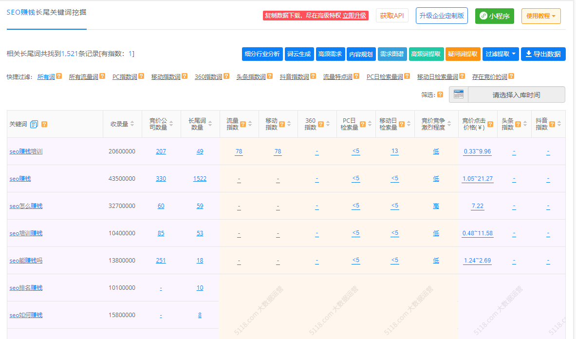现在很多第三方工具都可以很方面的挖掘关键词,比如说站长词库、爱站工具、5118、金花关键词挖掘工具等等。如果对关键词的数量要求不是很高的话,用这些关键词挖局工具的免费功能就可以,如果对于关键词的量要求很大,那么可以考虑付费成为VIP用户。